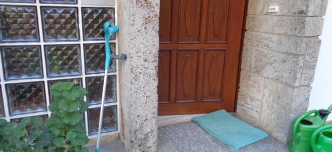 Ob sie nicht vielleicht die Krücke mitnehmen will, frage ich. Oh ja sicher, die braucht sie, wenn sie nachher den schweren Korb trägt. Gestern war die Krücke verschwunden, sowas blödes. Auf dem Schuppendach hat sie gelegen, da hatte sie sie drauf gelegt, weil die beim Brombeeren pflücken ja nicht hilft. Dann ist sie ohne gegangen. Das die Krücke nicht da war hat sie erst gemerkt, als die Nachbarin geklingelt hat und ganz verwundert war, als die Tür aufging. Ohne Krücke vor der Tür denken die Leute sie wäre nicht zu Hause.