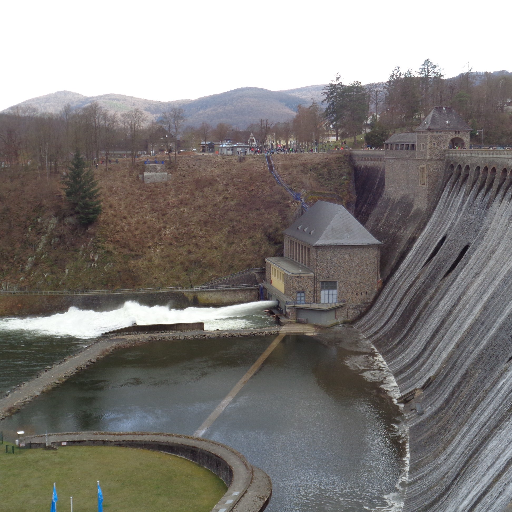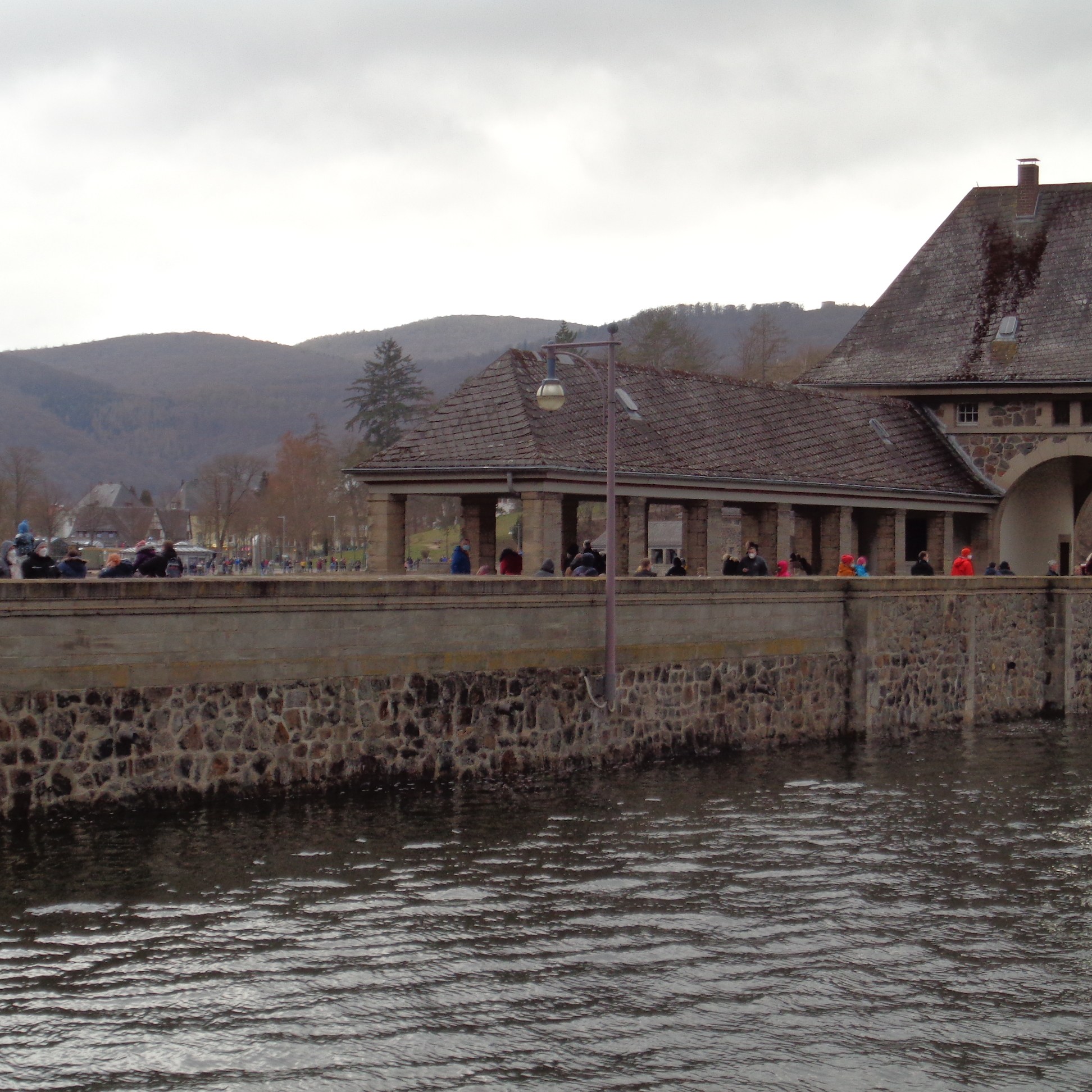Das habe ich aber völlig unterschätzt. Wäre es ein Sonntag nachmittag im Juli, würde man sagen, gut was los, hier. Für einen Mittwoch abend bei regnerischen fünf Grad ist es schlicht der Wahnsinn. Die Talsperre läuft über, das haben wir alle, obwohl wir nur eine halbe Stunde weg wohnen, noch nie gesehen. Hunderte andere anscheind auch nicht. In den zwanzig Minuten, die man braucht, um einmal hin und her zu laufen, sehe ich mehr Menschen, als im ganzen letzten Jahr zusammen.